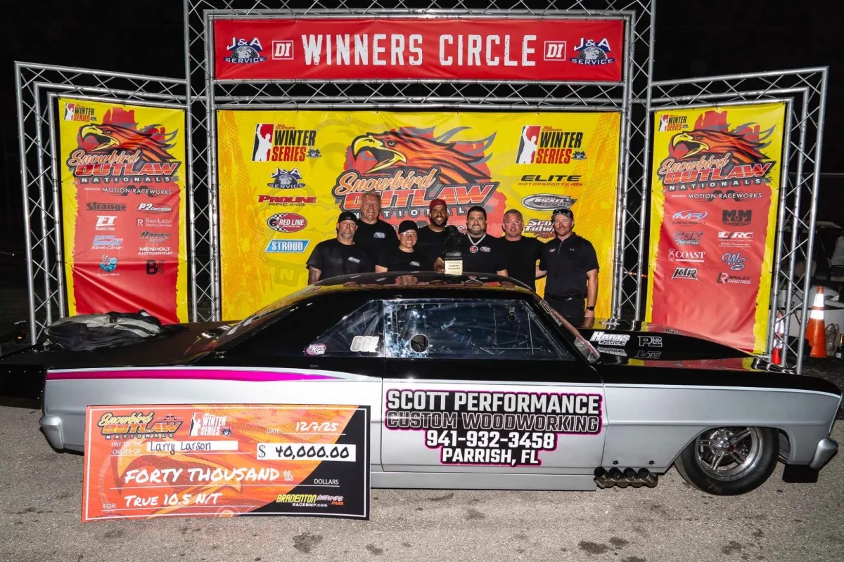 Larry Larson rolled into elimination day at the Snowbird Outlaw Nationals at Bradenton Motorsports Park with a tough draw right out of the gate, taking on Ryan Martin and the Fireball Camaro in Round One. From there, Larson’s Harts-charged hot rod just kept picking up steam.