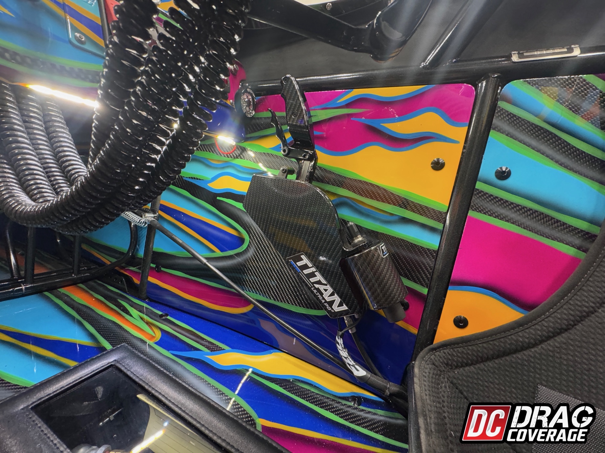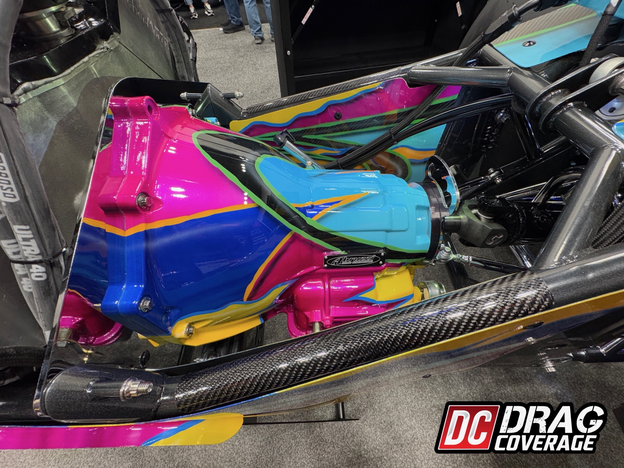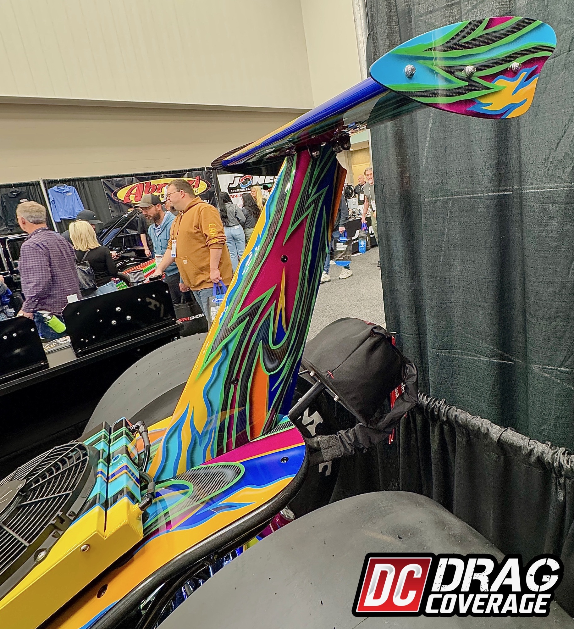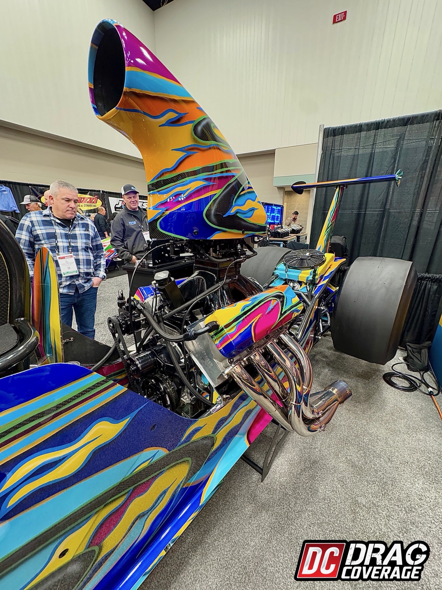 For PRI, Johnny wanted a car that would stop people in their tracks. This dragster is fully painted from top to bottom—including the entire underside—with the design executed in-house just like the rest of the build. Mirrors are set up in the booth so fans can see every bit of the detailed artwork that normally stays hidden.